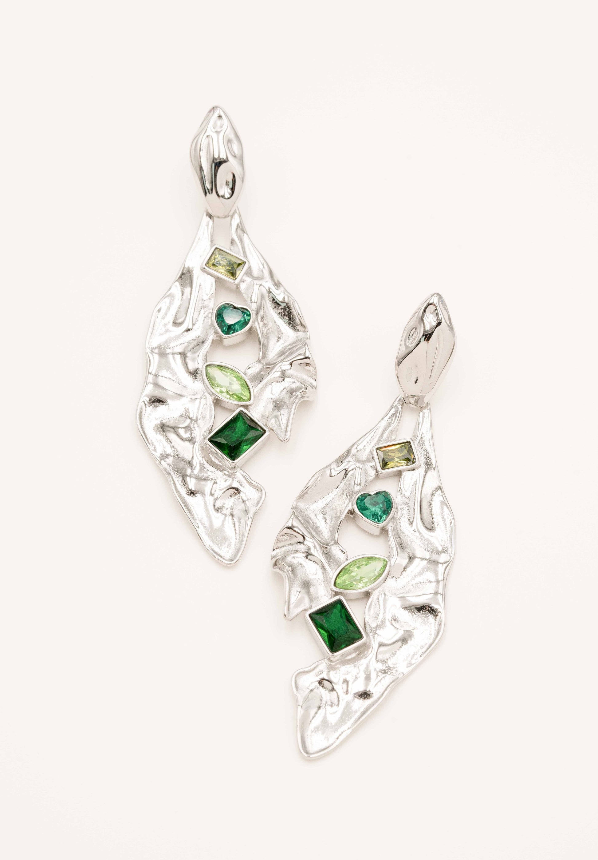 Maxi Boucles d'oreilles à puce en acier inoxydable composées de motifs géométriques texturés et d'oxydes de zirconium géométriques.