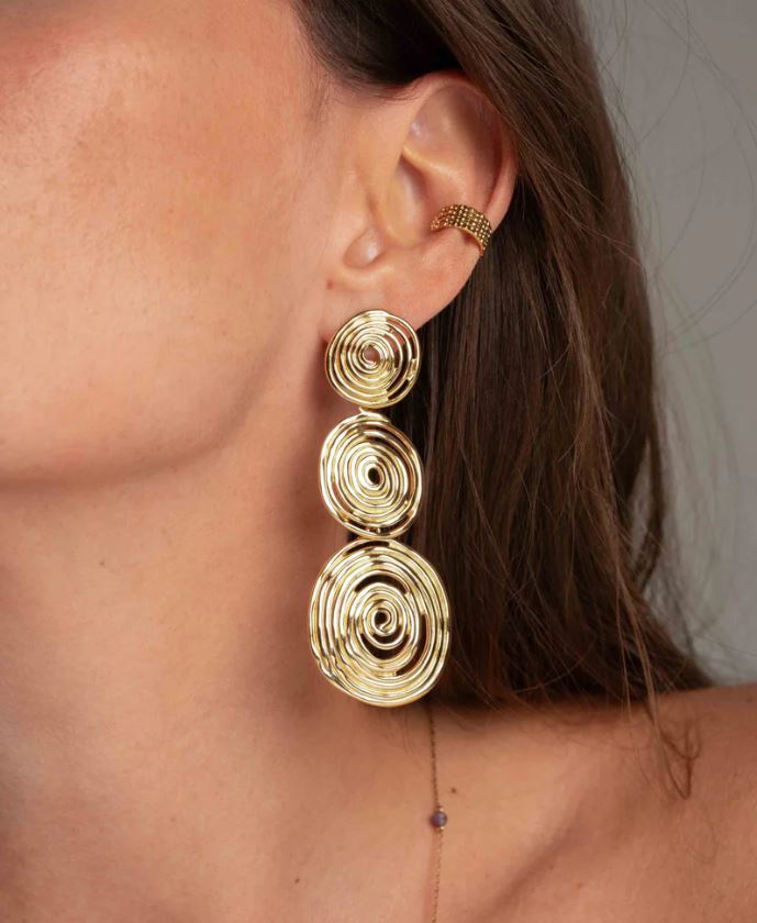 - Boucles d'oreilles pendantes en acier inoxydable composées de 3 empiècements ronds en forme de spirale.