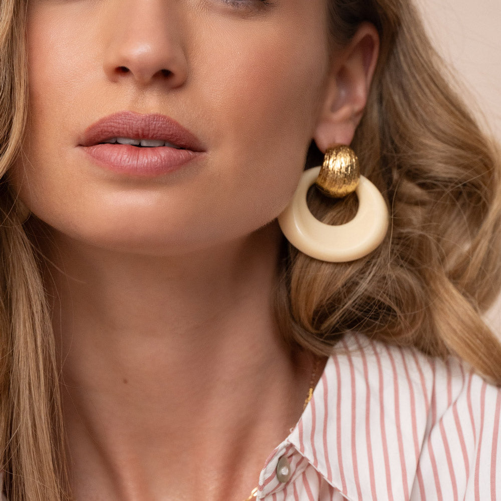 - Boucles d'oreilles à puce en acier inoxydable composées d'une forme bombée texturée et d'un empiècement en acétate coloré.