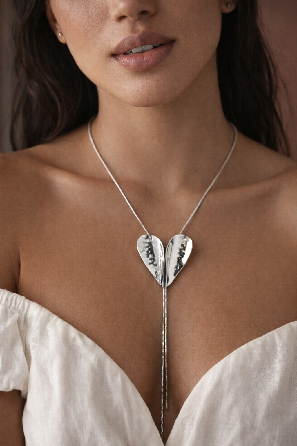 Son grand cœur incurvé et texturé, associé à une élégante chaîne façon cravate, sublime le décolleté avec caractère et modernité. Une pièce forte, idéale pour rehausser aussi bien une tenue du quotidien qu’un look plus habillé.